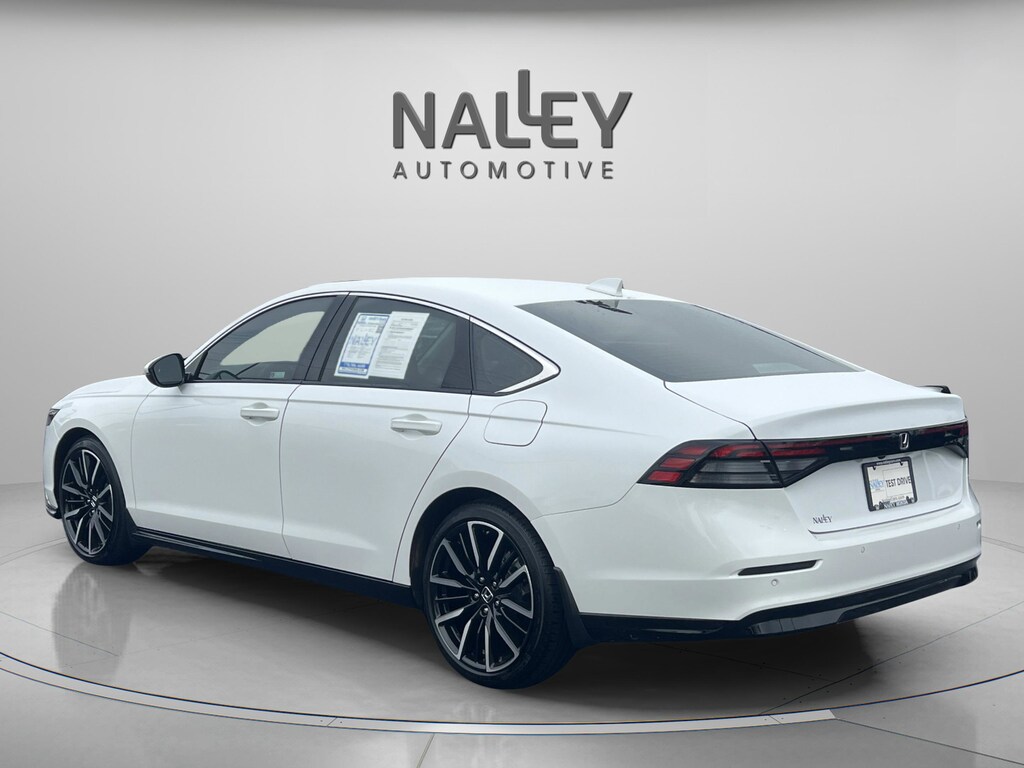 Under the hood, the Accord Hybrid Touring pairs a refined **2.0-liter Atkinson-cycle 4-cylinder** with a two-motor hybrid system, producing a combined **204 horsepower** while achieving an excellent **EPA rating of 46 mpg city / 41 mpg highway / ~44 mpg combined**.